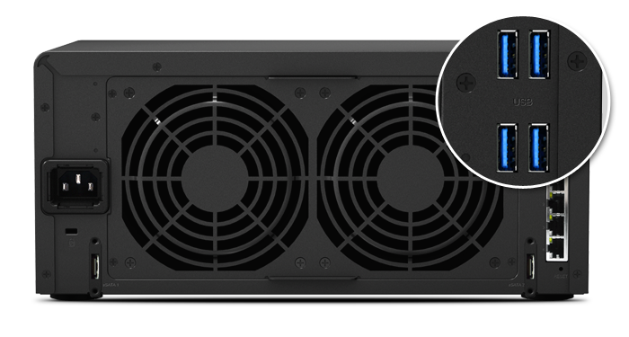 DS1815+ 配備 USB 3.0 和 eSATA 埠,可與外部存儲設備連接,同時提供高速、有效的文件傳輸。USB 3.0 埠能提供高達 5Gbps 的傳輸速度 (比 USB 2.0 快 10 倍),不僅節(jié)省外接硬盤的數據傳輸時間,也可降低耗電量。