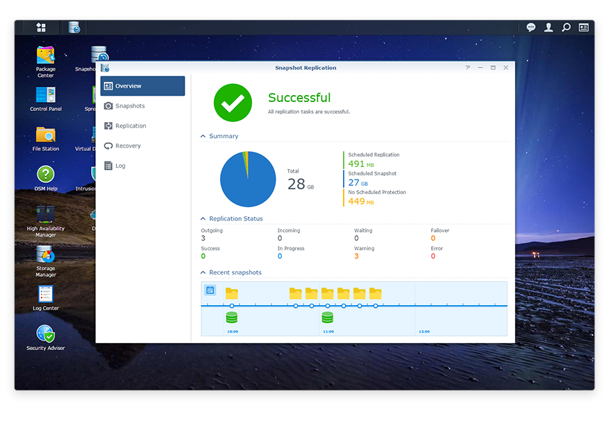 Synology DS916+ 可作為一個集中化的備份目的地。無論你是 Windows 或 Mac 使用者,你都可以使用 Cloud Station Backup 直接將電腦中的文件備份到你的 Synology NAS,任何時候做的修改都會自動備份到 DS916+。Mac 使用者也可享受熟悉的 Apple® Time Machine 備份經(jīng)驗 。你也可以將 DS916+ 上的數(shù)據(jù)備份到另一臺 DiskStation、其它 rsync 兼容服務(wù)器、外接設(shè)備,甚至是 Amazon® S3、Glacier cloud service、Microsoft Azure、SFR 和 hicloud 等公有云服務(wù)。Synology Hyper Backup 讓你可運行備份任務(wù)排程,以及將服務(wù)器回復(fù)到過去特定的時間點。同時,不同版本間只備份經(jīng)過修改的數(shù)據(jù),以降低消耗的存儲空間和處理時間。