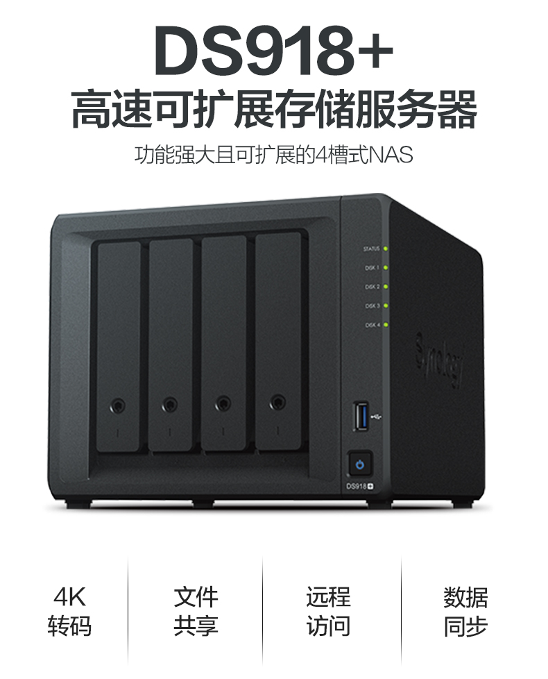 DS918+ 支持多達(dá)兩個(gè) M.2 NVMe 2280 SSD,無(wú)需占用內(nèi)部硬盤插槽即可快速創(chuàng)建系統(tǒng)緩存。DS918+ 可通過(guò) Synology 擴(kuò)充設(shè)備 DX517 擴(kuò)展到多達(dá) 9 個(gè)硬盤,滿足了對(duì)靈活存儲(chǔ)容量的需求。