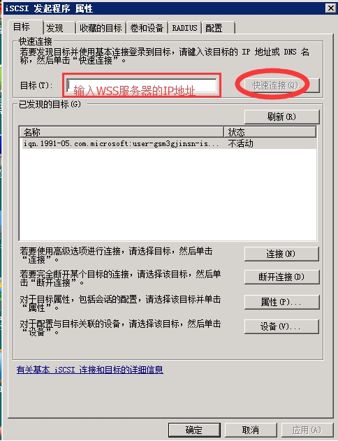 打開(kāi)ISCSI 配置界面,在目標(biāo)中輸入WSS服務(wù)器的IP地址,然后點(diǎn)擊"快速連接",當(dāng)連接成功后完成后續(xù)配置。