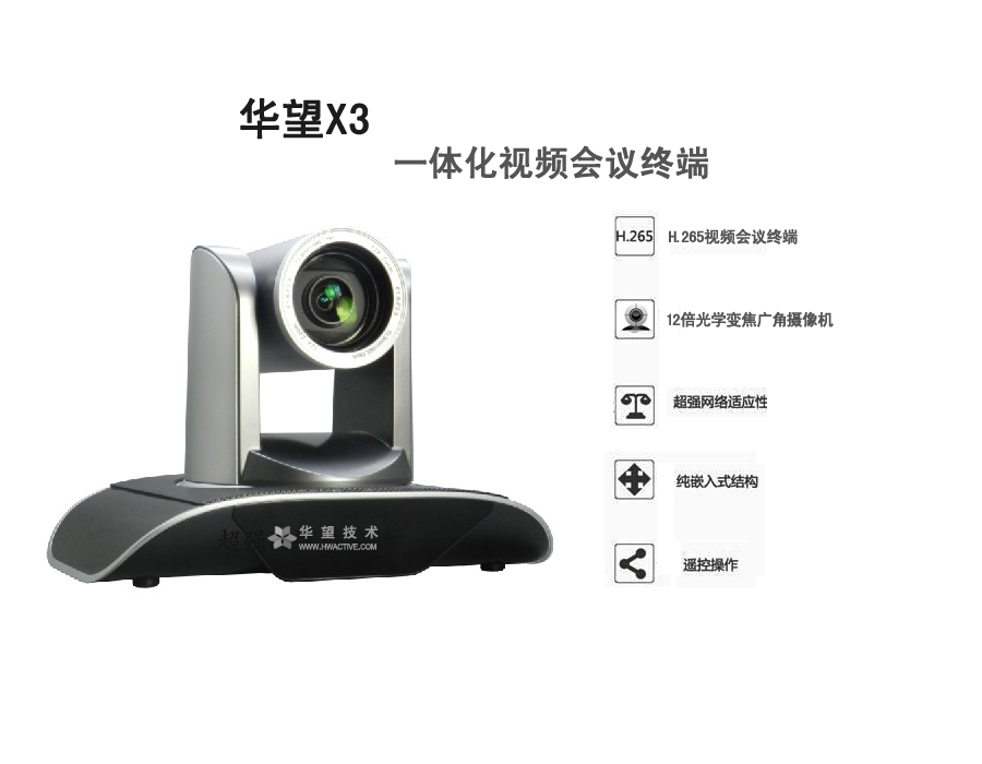 產(chǎn)品特性:內(nèi)置高清視頻會議終端+12倍光學(xué)變焦廣角攝像機,安裝部署更簡單;業(yè)界首推H.265編解碼,降低40%帶寬占用;1080P高清分辨率;支持遙控器操作